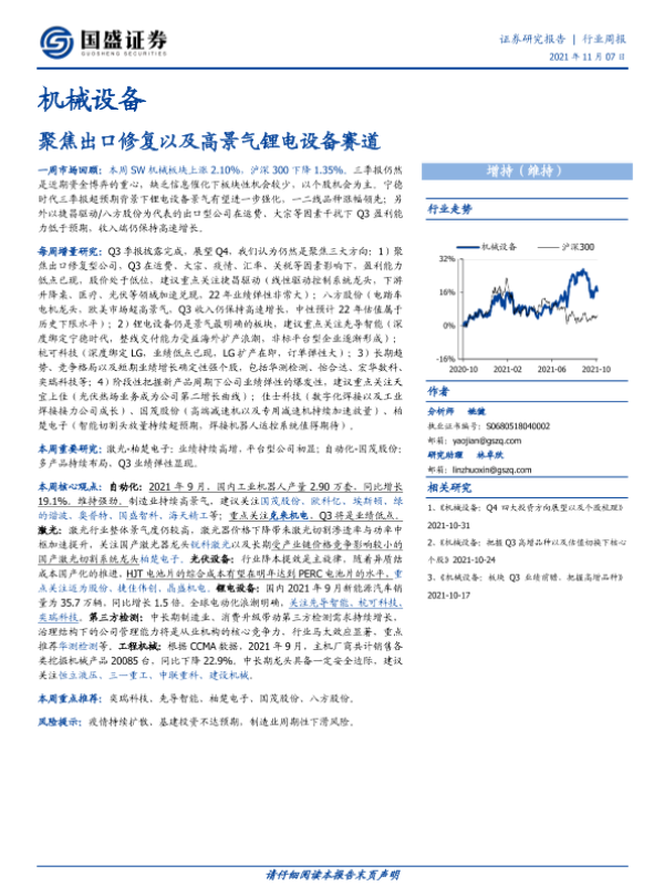 【国盛证券】【20211107】20211107-国盛证券-机械设备行业周报:聚焦出口修复以及高景气锂电设备赛道-11页 行业研究
