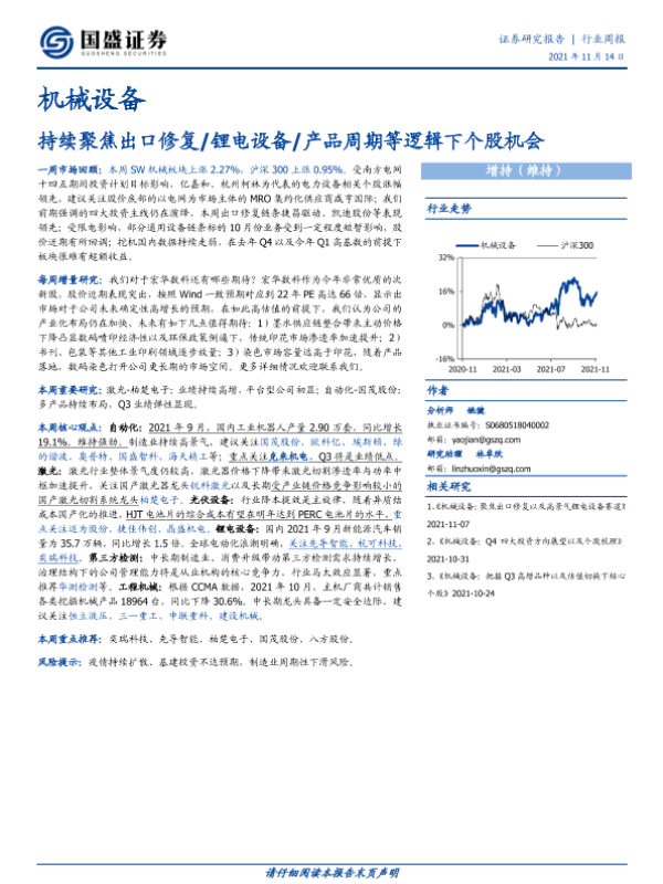 【国盛证券】【20211114】20211114-国盛证券-机械设备行业周报:持续聚焦出口修复 锂电设备 产品周期等逻辑下个股机会-12页 行业研究