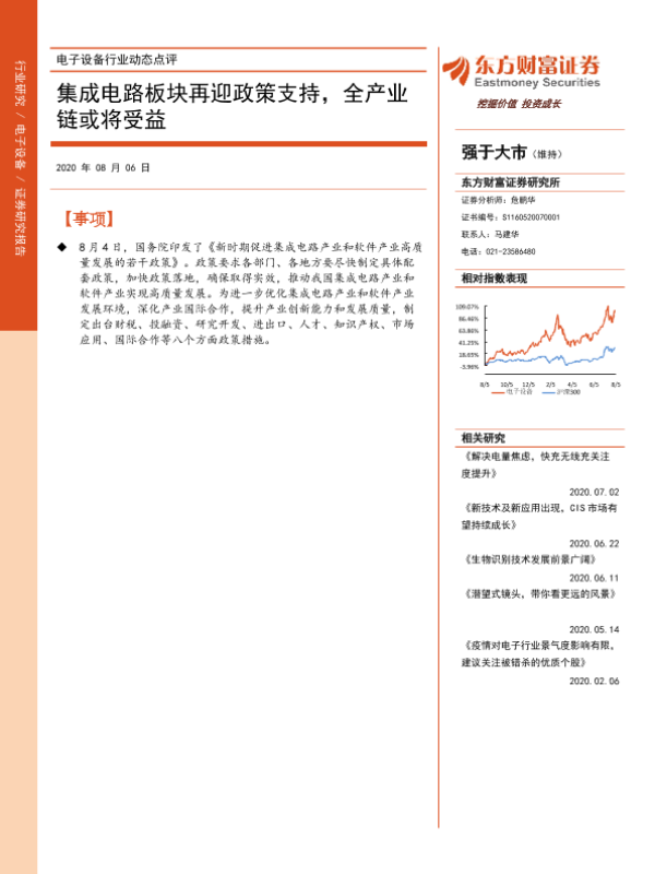 【东方财富证券】【20200806】电子设备行业动态点评:集成电路板块再迎政策支持,全产业链或将受益-3页 行业研究
