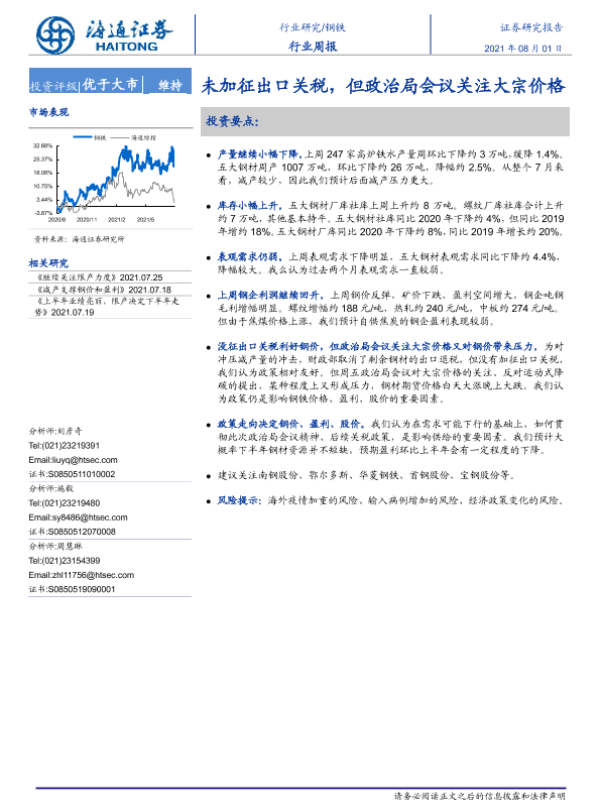 【海通证券】【20210801】20210801-海通证券-钢铁行业周报:未加征出口关税,但政治局会议关注大宗价格-13页 行业研究