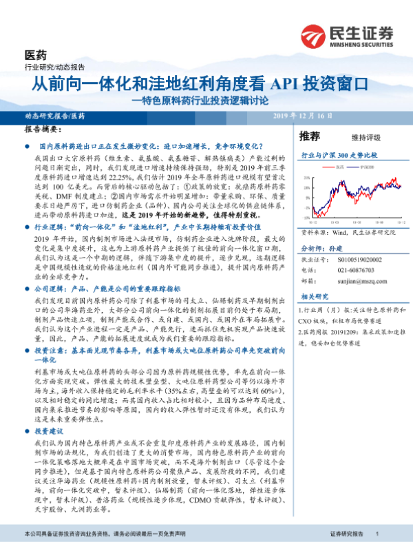 【民生证券】【20191216】从前向一体化和洼地红利角度看API投资窗口——特色原料药行业投资逻辑讨论-13页 行业研究