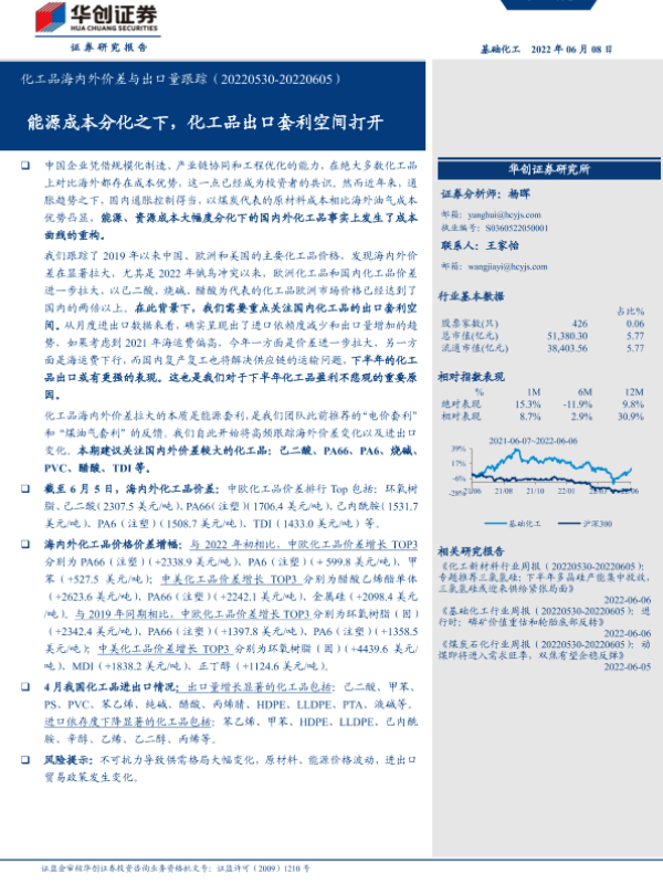 【华创证券】【20220608】基础化工:化工品海内外价差与出口量跟踪:能源成本分化之下,化工品出口套利空间打开-41页 行业研究