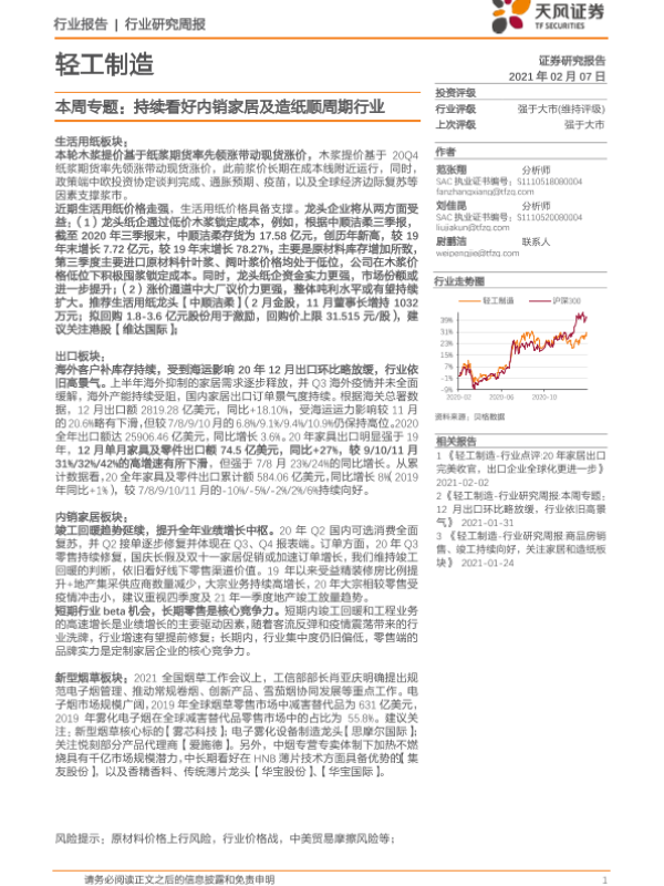 【天风证券】【20210207】20210207-天风证券-轻工制造本周专题:持续看好内销家居及造纸顺周期行业-19页 行业研究
