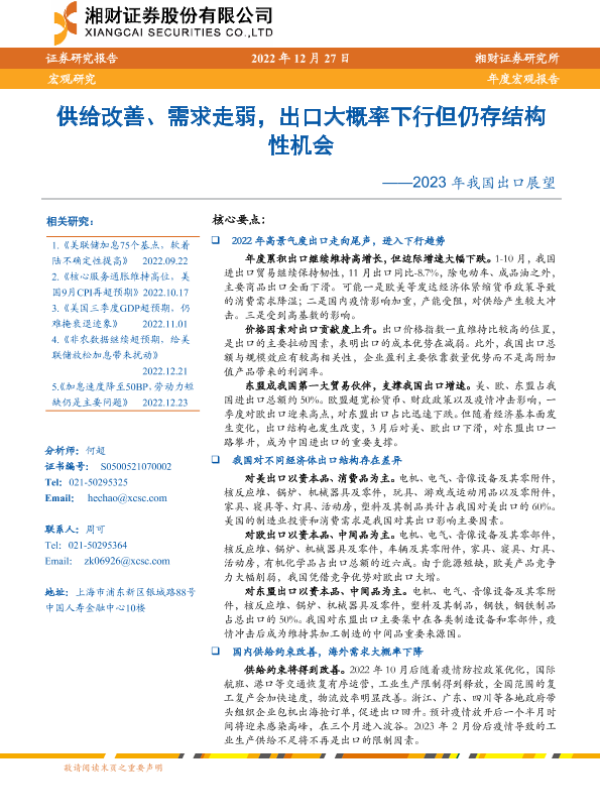 【湘财证券】【20221227】2023年我国出口展望:供给改善、需求走弱,出口大概率下行但仍存结构性机会-20页 宏观策略