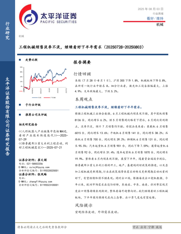 【太平洋证券】【20250803】工程机械销售淡季不淡,继续看好下半年需求-13页 证券期货研究报告