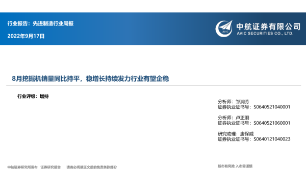 【中航证券】【20220917】8月挖掘机销量同比持平,稳增长持续发力行业有望企稳-47页 行业研究