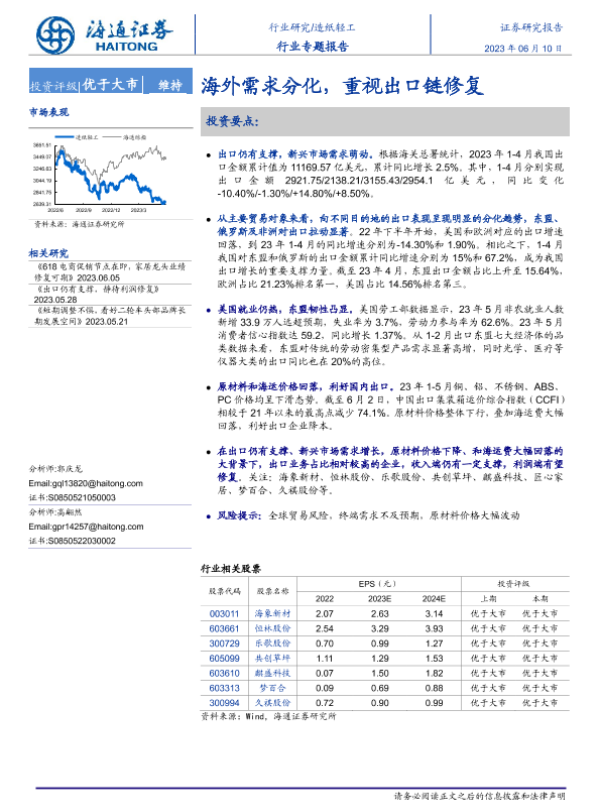 【海通证券】【20230610】20230610-海通证券-造纸轻工行业专题报告:海外需求分化,重视出口链修复-13页 行业研究