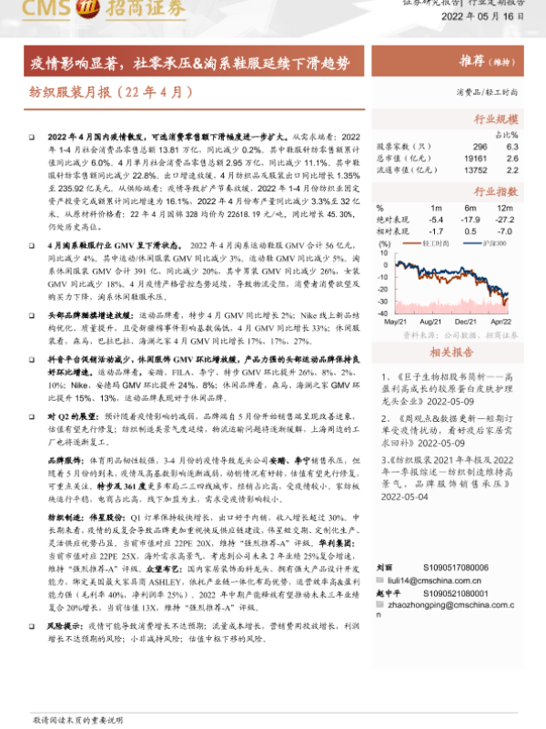 【海通证券】【20220516】纺织服装月报(22年4月):疫情影响显著,社零承压&淘系鞋服延续下滑趋势-10页 行业研究