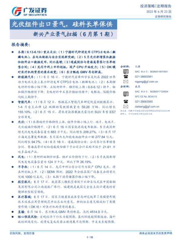 【广发证券】【20220623】新兴产业景气扫描:光伏组件出口景气,硅料长单保供-15页 行业研究