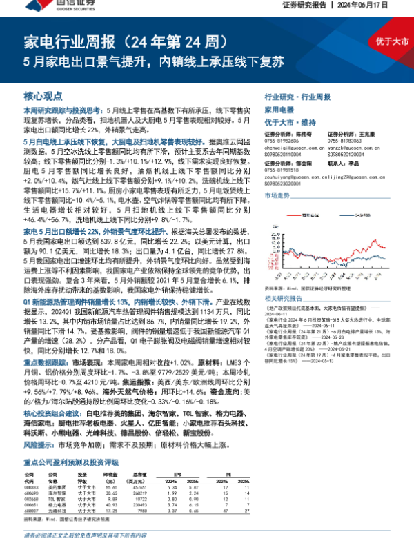 【国信证券】【20240617】20240617-国信证券-家电行业周报(24年第24周):5月家电出口景气提升,内销线上承压线下复苏-15页 行业研究