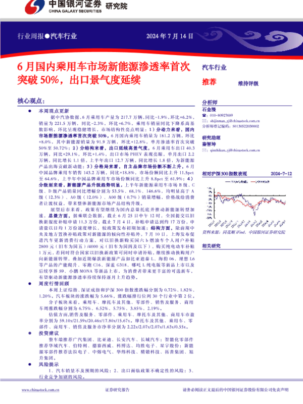 【银河证券】【20240714】20240714-中国银河-汽车行业行业周报:6月国内乘用车市场新能源渗透率首次突破50%,出口景气度延续-22页 行业研究