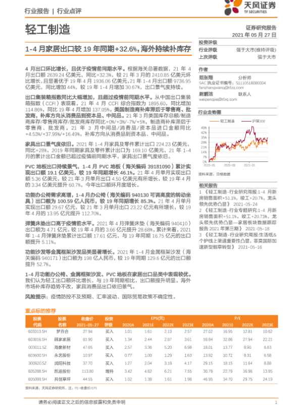 【天风证券】【20210527】轻工制造行业:1-4月家居出口较19年同期+32.6%,海外持续补库存-6页 行业研究