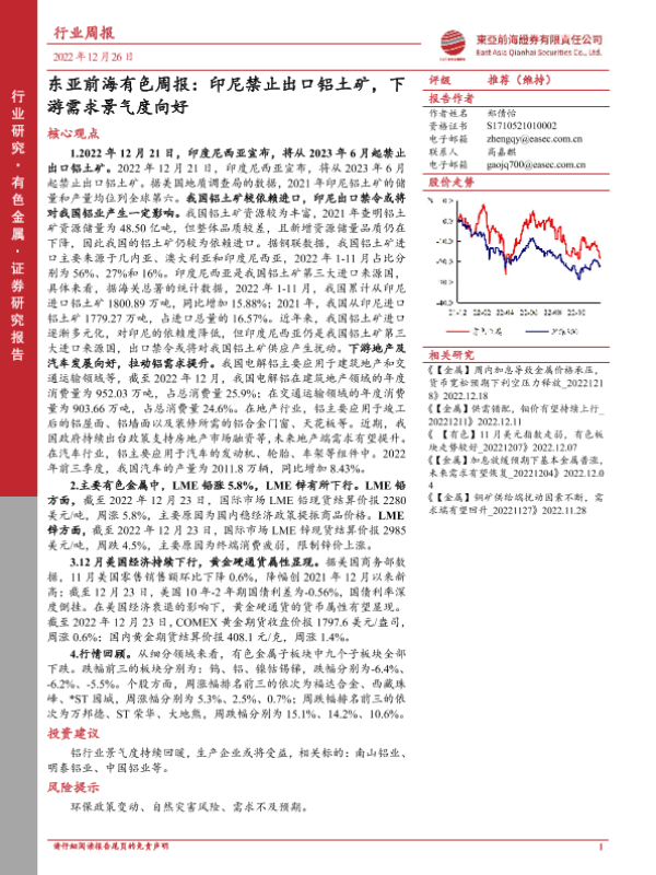 【东亚前海证券】【20221226】东亚前海有色周报:印尼禁止出口铝土矿,下游需求景气度向好-20页 行业研究