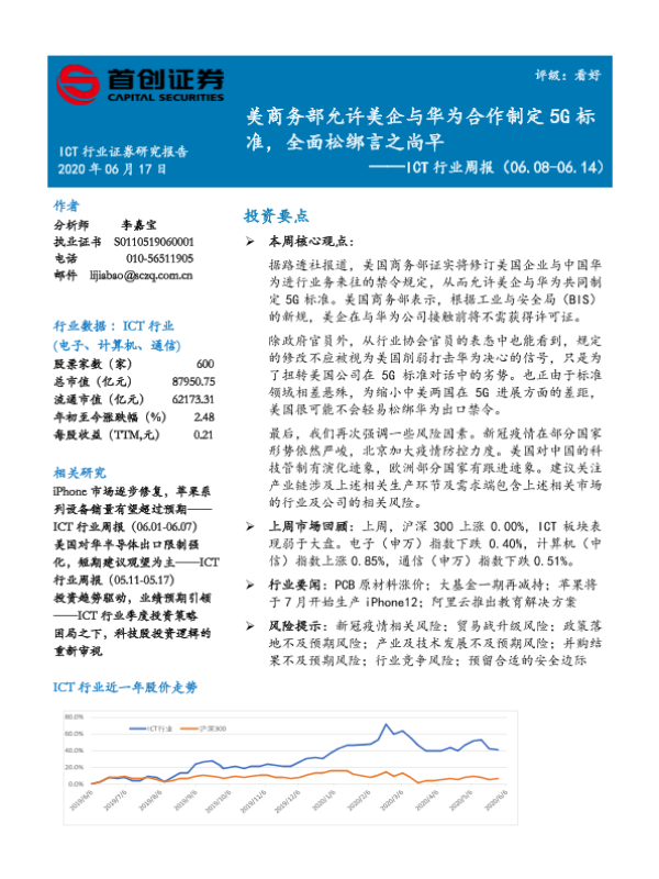 【首创证券】【20200617】ICT行业周报:美商务部允许美企与华为合作制定5G标准,全面松绑言之尚早-14页 行业研究