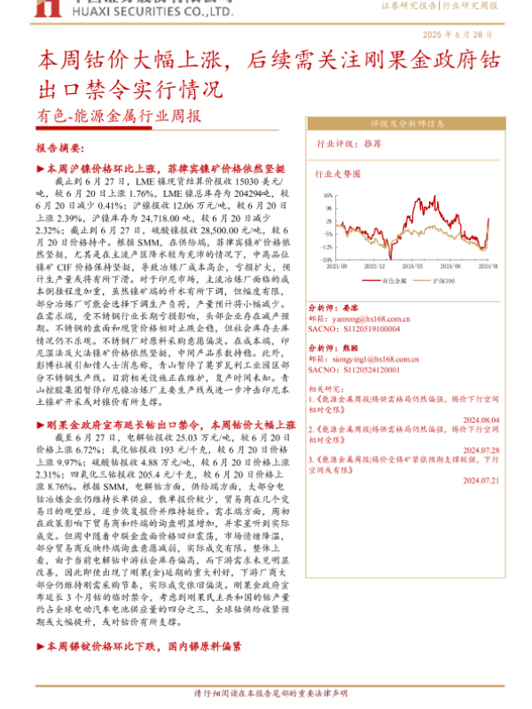 【华西证券】【20250628】有色-能源金属行业周报:本周钴价大幅上涨,后续需关注刚果金政府钴出口禁令实行情况-23页 行业研究