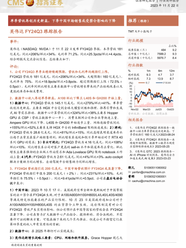 【海通证券】【20231122】英伟达FY24Q3跟踪报告-单季营收再创历史新高,下季中国市场销售或受禁令影响而下降-14页 行业研究