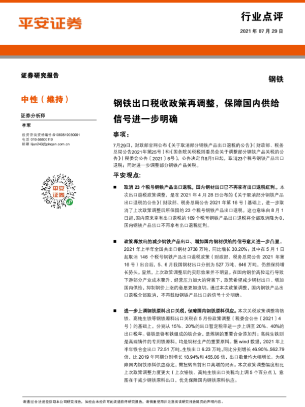 【平安证券】【20210729】钢铁行业点评:钢铁出口税收政策再调整,保障国内供给信号进一步明确-3页 行业研究