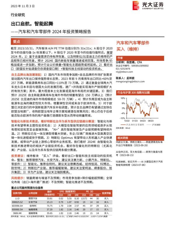 【光大证券】【20231103】汽车和汽车零部件2024年投资策略报告:出口启航,智能起舞-45页 行业研究