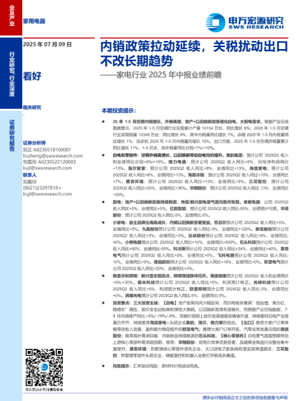 【申万宏源】【20250709】家电行业2025年中报业绩前瞻:内销政策拉动延续,关税扰动出口不改长期趋势-26页 行业研究