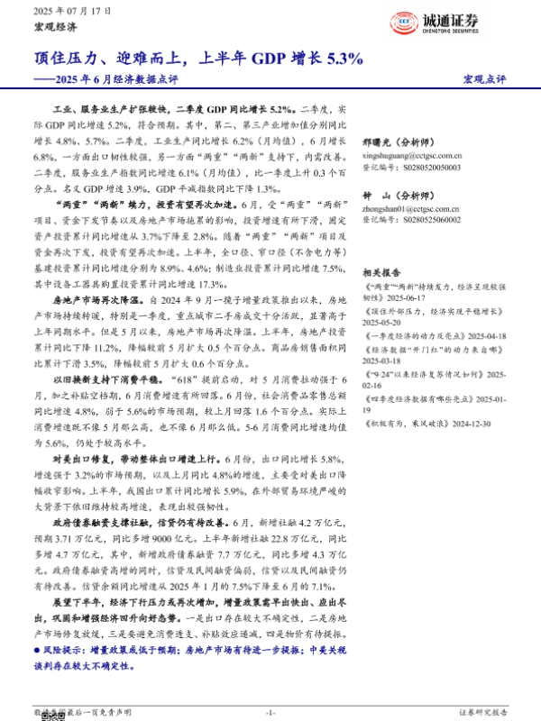 【诚通证券】【20250717】2025年6月经济数据点评:顶住压力、迎难而上-16页 宏观策略