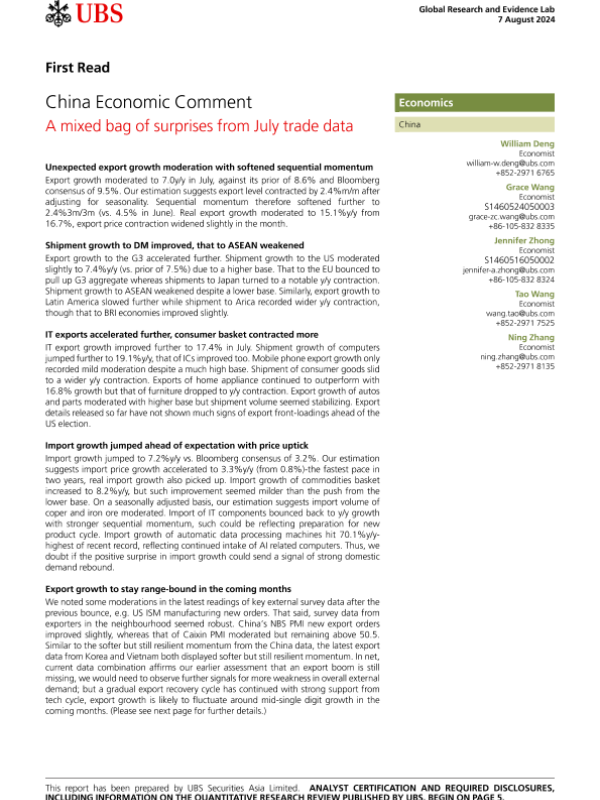 【UBS Securities Asia Limited】【20240807】China Economic Comment A mixed bag of surprises from July trade data-8页 行业研究
