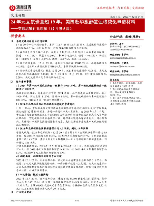 【浙商证券】【20231231】交通运输行业周报:24年元旦航班量超19年,美国赴华旅游签证将减免申请材料-16页 行业研究