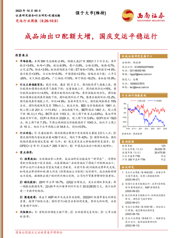 【西南证券】【20221009】交运行业周报:成品油出口配额大增,国庆交运平稳运行-20页 行业研究