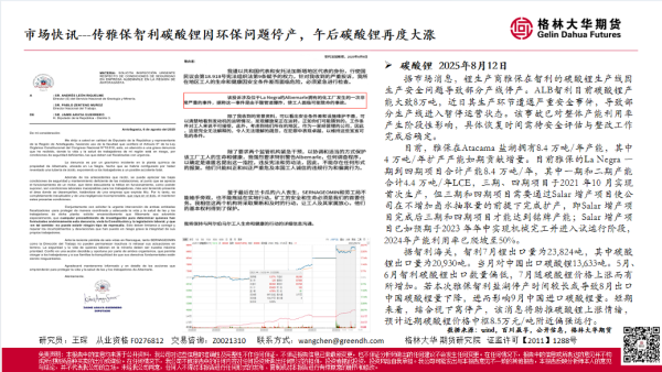 【格林大华期货】【20250812】市场快讯:传雅保智利碳酸锂因环保问题停产,午后碳酸锂再度大涨-1页 证券期货研究报告