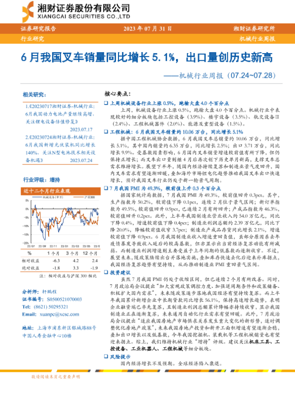 【湘财证券】【20230731】20230731-湘财证券-机械行业周报:6月我国叉车销量同比增长5.1%,出口量创历史新高-13页 行业研究