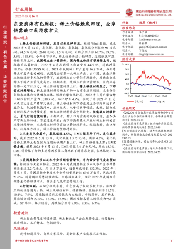 【东亚前海证券】【20220516】东亚前海有色周报:稀土价格触底回暖,全球供需缺口或持续扩大-21页 行业研究