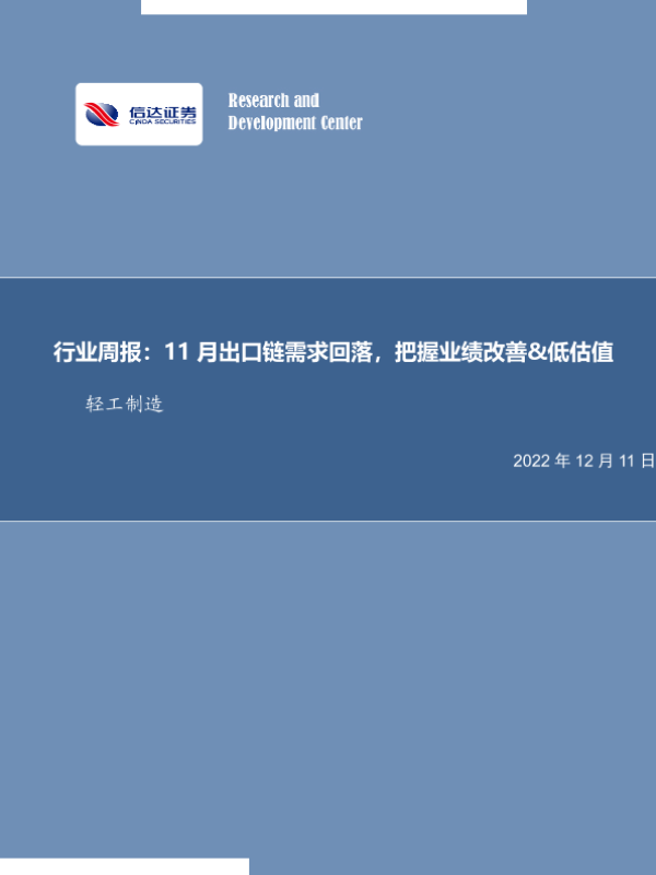 【信达证券】【20221211】轻工制造行业周报:11月出口链需求回落,把握业绩改善&低估值-19页 行业研究