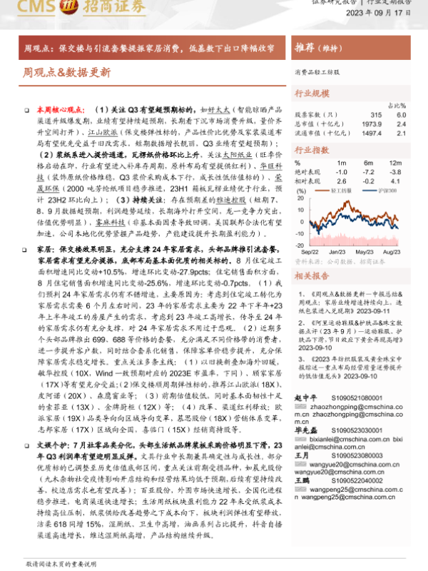【海通证券】【20230917】20230917-招商证券-消费品轻工纺服周观点&数据更新周观点:保交楼与引流套餐提振家居消费,低基数下出口降幅收窄-35页 行业研究