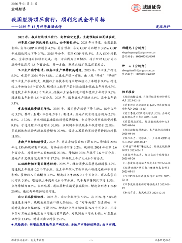 【诚通证券】【202512】2025年12月经济数据点评:我国经济顶压前行,顺利完成全年目标-15页 证券期货研究报告