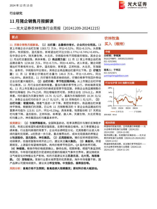 【光大证券】【20241215】20241215-光大证券-农林牧渔行业周报:11月猪企销售月报解读-14页 行业研究