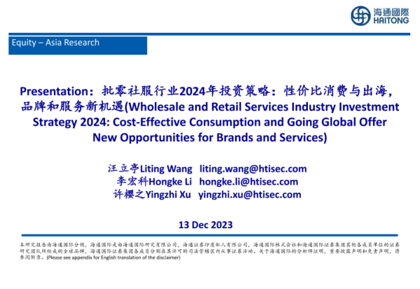 【海通国际】【20231213】批零社服行业2024年投资策略:性价比消费与出海,品牌和服务新机遇-50页 行业研究