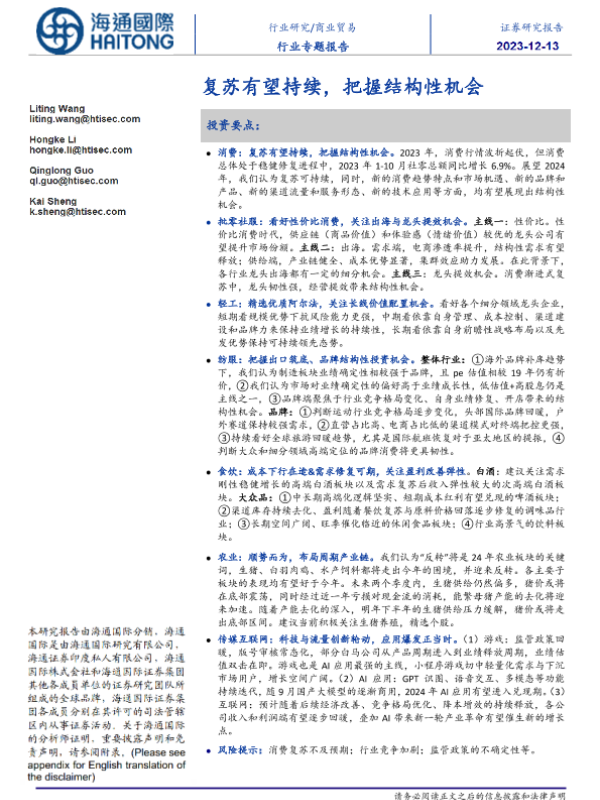 【海通国际】【20231213】商业贸易行业专题报告:复苏有望持续,把握结构性机会-14页 行业研究