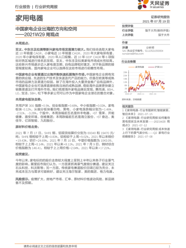【天风证券】【20210719】家用电器2021W29周观点:中国家电企业出海的方向和空间-16页 行业研究
