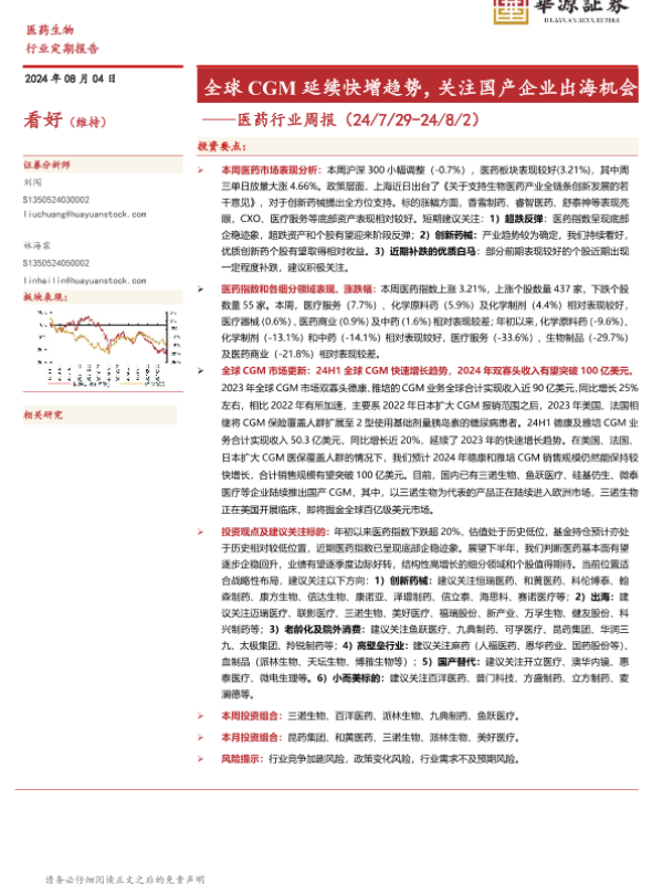 【华源证券】【20240804】医药行业周报:全球CGM延续快增趋势,关注国产企业出海机会-12页 行业研究