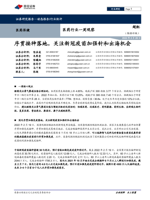 【国信证券】【20220220】医药行业一周观察:序贯接种落地,关注新冠疫苗加强针和出海机会-11页 行业研究