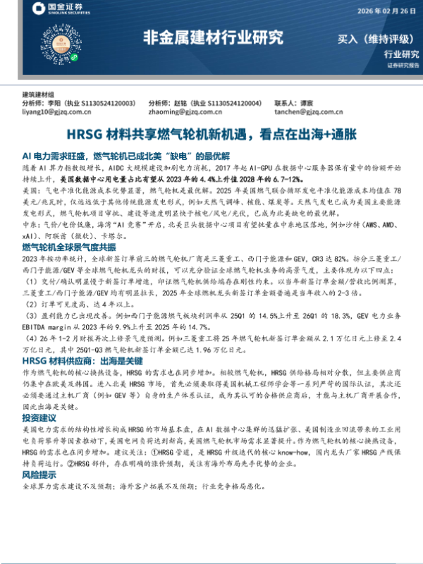 【国金证券】【2025】HRSG材料共享燃气轮机新机遇,看点在出海+通胀-15页 证券期货研究报告