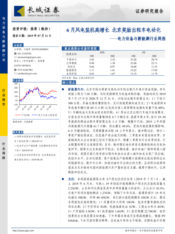 【长城证券】【20190721】20190721-长城证券-电力设备与新能源行业周报:6月风电装机高增长 北京奖励出租车电动化-18页 行业研究