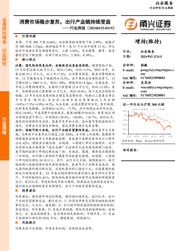 【甬兴证券】【20240124】社会服务行业周报:消费市场稳步复苏,出行产业链持续受益-12页 行业研究