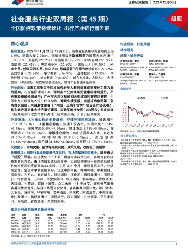【国信证券】【20221204】社会服务行业双周报(第45期):全国防控政策持续优化 出行产业链行情升温-15页 行业研究