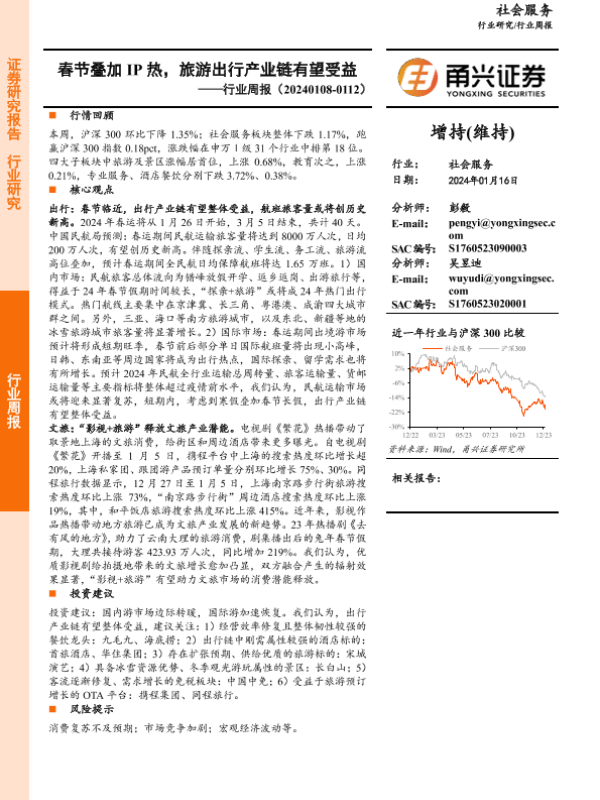 【甬兴证券】【20240116】社会服务行业周报:春节叠加IP热,旅游出行产业链有望受益-12页 行业研究