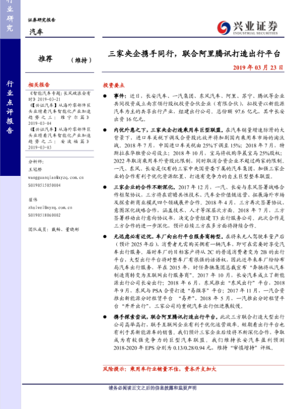 【兴业证券】【20190323】三家央企携手同行,联合阿里腾讯打造出行平台-3页 行业研究