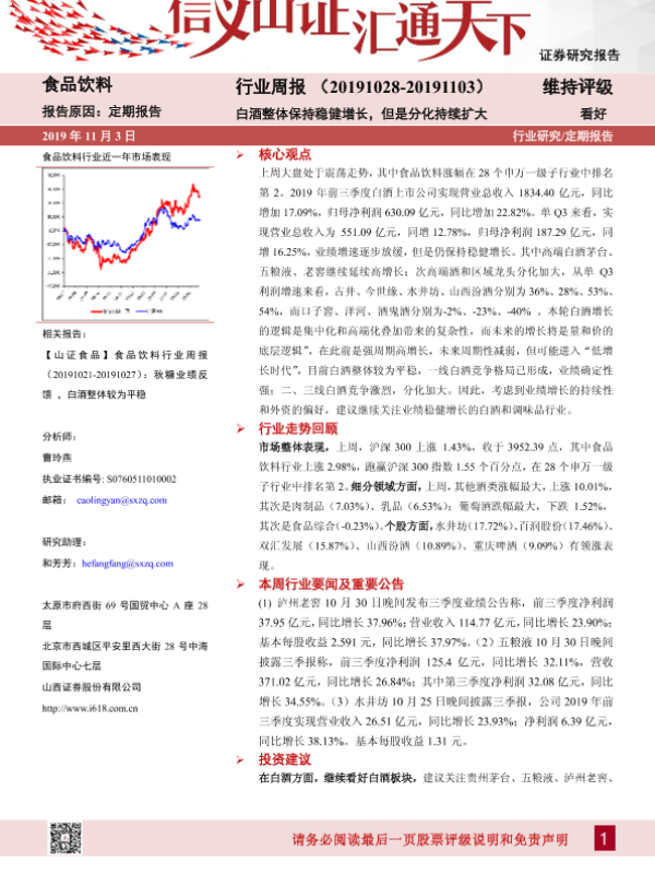 【山西证券】【20191103】食品饮料行业周报:白酒整体保持稳健增长,但是分化持续扩大-11页 行业研究
