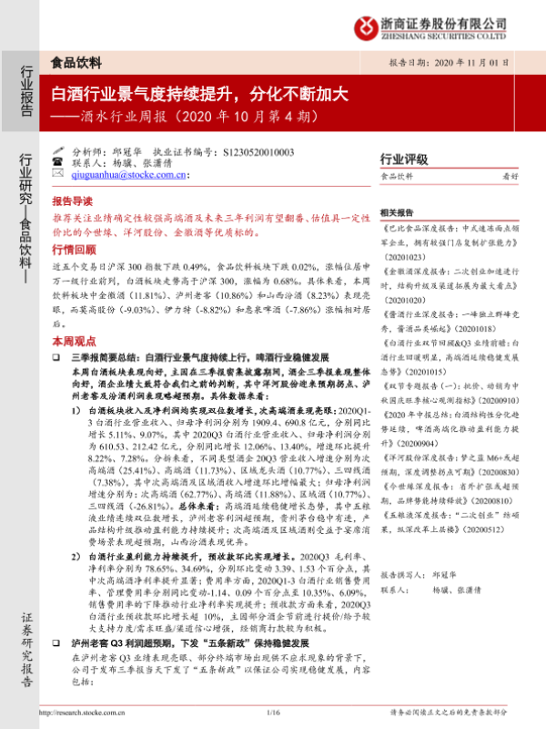 【浙商证券】【20201101】20201101-浙商证券-酒水行业周报(2020年10月第4期):白酒行业景气度持续提升,分化不断加大-16页 行业研究