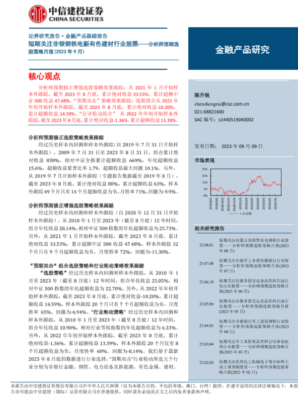 【中信建投证券】【20230909】分析师预期选股策略月报(2023年9月):短期关注非银钢铁电新有色建材行业股票-15页 行业研究