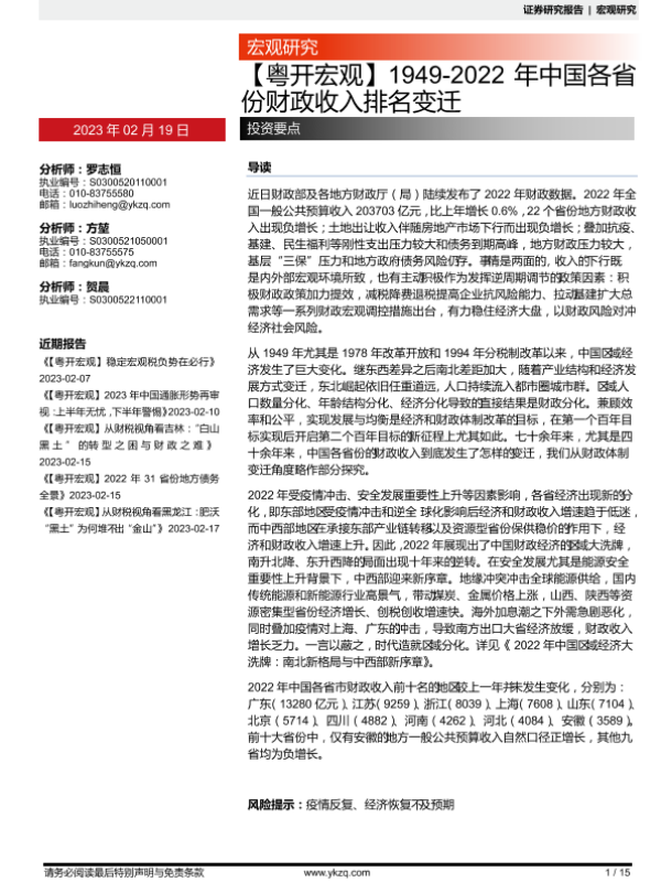 【粤开证券】【20230219】1949-2022年中国各省份财政收入排名变迁-15页 行业研究
