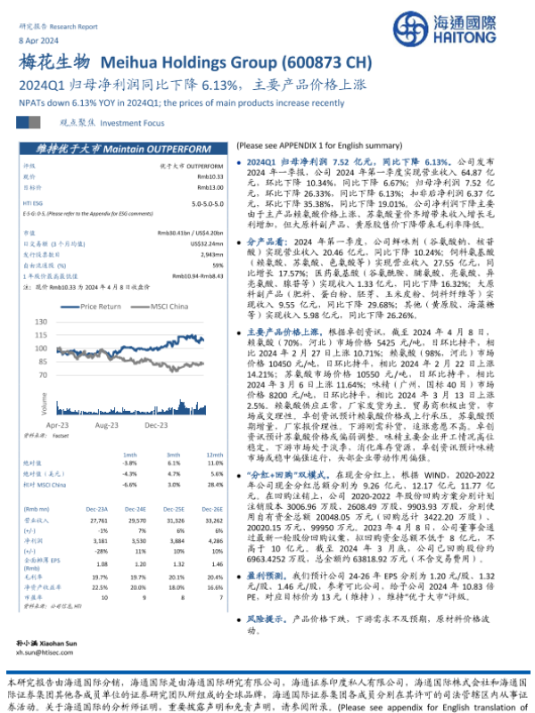 【海通国际】【20240408】梅花生物-2024Q1归母净利润同比下降6.13%,主要产品价格上涨-13页 行业研究